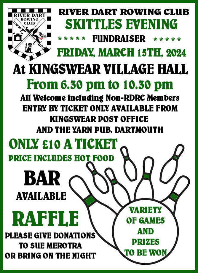 On the 15th March 2024 the club held a social skittles evening, with food, at the village hall in Kingswear. The ticketed event was well attended and open to both club and non-club members. Great fun was had by all raising over £800 towards club funds to help with maintenance costs of boats and oars. It is hoped we will be able to purchase at least one new oar at a cost of over £500 per oar.